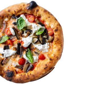 Base de tomates mûries au soleil, généreusement garnie de mozzarella fior di latte fondante, stracciatella onctueuse, aubergine fraiche, parmesan italien et tomates cerises croquantes, couronnée de basilic frais.